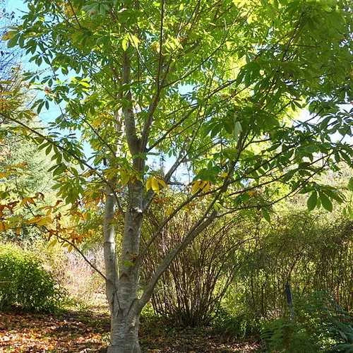 Related to the familiar, naturalised horse chestnut, Aesculus indica was brought to this island from the Himalaya in the mid-19th century. A large, deciduous tree, it is smaller, and has a rather more open habit than the horse chestnut. The tree is covered with huge ‘candles’ of creamy-pink flowers in mid-summer, an invaluable nectar-source for bees. These are followed in autumn by masses of green fruit, smoother than the horse chestnut’s, which split to reveal ‘conkers’. The leaves are large, and divided into oblong leaflets; bronze when young, they turn glossy green in summer and yellow in autumn. The Indian Horse Chestnut makes a good specimen tree for parks or large gardens, and grows well even on chalky soils.