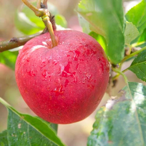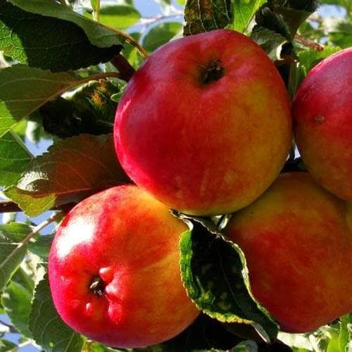 One of the best early to mid-season apple varieties, Apple Katy, aka Katya produces medium-sized, red over yellow-green, with cream-coloured, fairly crisp apples with exceptionally juicy flesh. Good, slightly sharp flavour and very firm skin – good for packed lunches and liked by children. The tree is shapely, even with limited pruning, and fairly vigorous. Very reliable, heavy cropper. Spur-bearer; produces spurs readily, even without pruning. The blossom is particularly attractive and long-lasting, making it an excellent pollinator, and is tolerant of late frosts, so good for colder areas. Keeps only for a week or so; use any you can’t eat for juicing or cooking. Resistant to most diseases, particularly canker, and produces well even in poor weather. Does best on rich soil. A very easy and reliable apple, ideal for inexperienced growers, and a most attractive specimen tree for gardens.