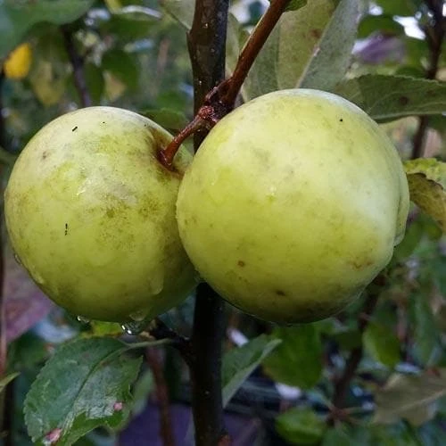 Not actually a crab-apple, Apple Keegan’s Crab is an Irish heritage variety of dessert apple from Co. Armagh, dating from the late 19th century. The fruit is medium to large, unevenly shaped, green to yellowish-green, speckled, and netted with russet. The flesh is sweet, very crisp and juicy. The tree is a heavy cropper. Tip-bearer, so is not suitable for trained forms; occasional renewal pruning required. Mid- to late season flowering, so good for colder areas. Very good keeper. Disease-resistant.