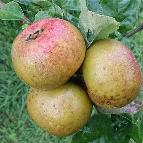 An Irish heritage variety, also known as Irish Russet, Apple Sam Young was first recorded in the early 19th century and was widely grown and appreciated throughout the country. A late dessert apple, it is small, round and flattened, green to greenish-yellow, occasionally showing a faint orange blush or red stippling; it is almost covered with greyish russeting, and often develops cracks. If this sounds unattractive, just taste one! The greenish-white flesh is firm and juicy, with a rich, winy flavour and perfect balance of sweetness and acidity – particularly good with cheese. Pick after leaf-fall, as the flavour improves the later it’s harvested. Very good keeper. Moderately vigorous, spreading tree, spur-bearer. Resistant to scab and canker, and a good choice for wetter areas.