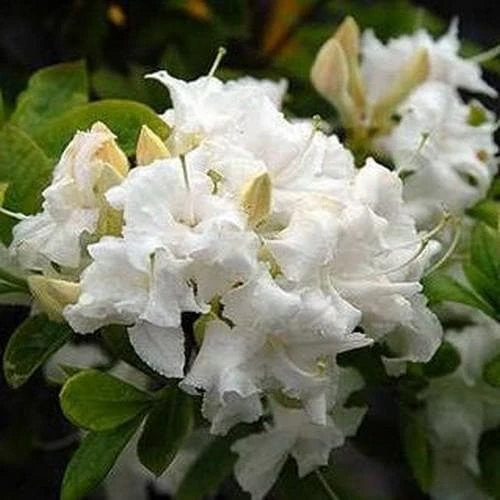 A compact hybrid azalea from the Knap Hill nursery, Rhododendron Whitethroat is a medium-sized, deciduous shrub with a neat, vase-shaped habit. The leaves are silvery light green, turning red and orange in autumn. In May and June, the shrub carries delightful, pure white, tubular, double flowers flaring out at their tips; the flowers are scented. Dead-head carefully (next year’s buds are just below this year’s flowers) to promote growth instead of seed production. Suitable for the smaller garden, it can be grown in soil-based ericaceous compost in a large container, using rain-water and ericaceous slow-release fertiliser. Azalea Whitethroat holds the RHS Award of Garden Merit.