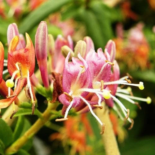 Named for Irish plant collector Augustine Henry, Lonicera henryi is a vigorous, woody, evergreen, climbing honeysuckle from western China. Downy stems carry glossy, deep green, pointed, elliptical leaves. In June and July, tubular, typical honeysuckle flowers in crimson and yellow are produced, followed in autumn by black berries. The flowers are attractive to pollinators. Henry’s honeysuckle needs support; it can be grown through a hedge or tied into a trellis against a wall. In the coldest areas, it may be semi-evergreen, losing some leaves in winter. Prune and thin after flowering.