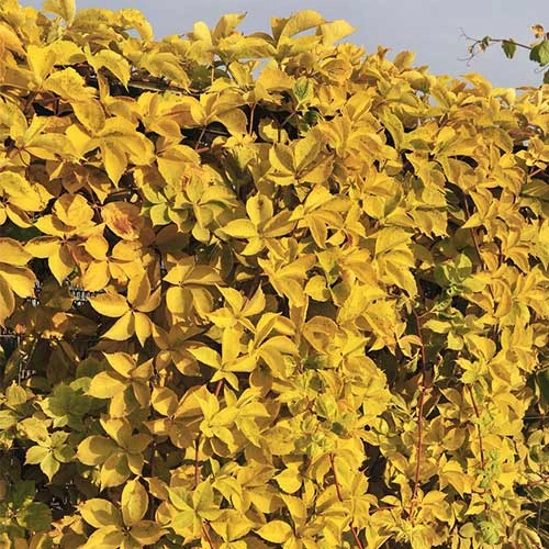 Quite a new cultivar of Virginia creeper with unusual autumn colour, Parthenocissus quinquefolia Yellow Wall is a very big, exceptionally vigorous, fast-growing, woody, deciduous climber, which climbs by means of suckers. The perfect site is a very large brick or stone wall – small structures will be rapidly overwhelmed, and the suckers find it hard to cling to very smooth surfaces. The mid-green, five-fingered leaves with serrated edges turn a rich, golden yellow in autumn. The insignificant green flowers are followed by small blue-black fruits which provide food for birds. Cut back Virginia creeper Yellow Wall if it gets near gutters, windows or slates, and be aware that it will root along the ground from trailing stems – this is a very vigorous plant which needs keeping in check, although it’s otherwise very easy to grow.