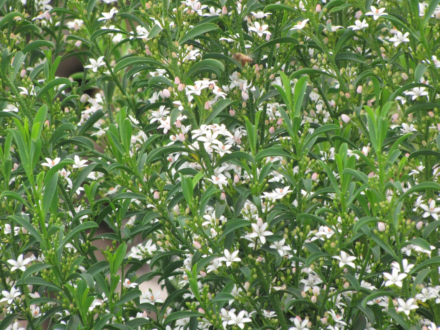 A tender, aromatic Australian shrub once known as Eriostemon myoporoides, Philotheca myoporoides has a very long flowering period. It’s a medium-sized to large, quite slow-growing, evergreen shrub with an upright, dense, rounded habit. The oblong to elliptical, deep green leaves, with paler undersides, are highly aromatic, scented of orange. In mild periods from autumn to late spring, pink buds open to single, starry, very fragrant, pinkish-white flowers. Except in completely frost-free areas, long-leaf wax flower should be grown in a cool greenhouse; it will tolerate low temperatures, down to 1ºC, but not frost. Minimal pruning needed.