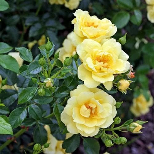 Rosa Flower Carpet Gold produces masses of butter yellow blooms throughout the summer and into Autumn. Repeat flowering, continuously from May to October. Disease resistant. Height & Spread: 2ft x 2ft