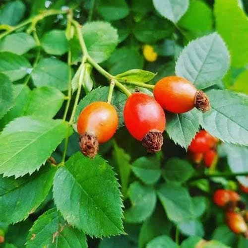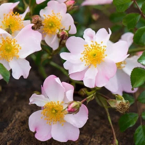 A vigorous ground-cover rose, Rosa Grouse, also known as Komimro has a prostrate, sprawling, trailing habit and sometimes roots as it spreads. The divided leaves are deep green and glossy. The delicate, single, pale pink flowers, 1 ½”/4cm across, with golden stamens, appear in summer; they are scented of musk. This rose does not repeat-flower, but bright red hips appear in autumn, giving a second season of interest. Ground-cover rose Grouse is a tough, disease-resistant rose, particularly useful on banks and slopes.