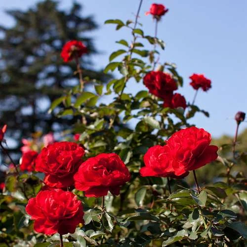 One of the best bright vermilion red Floribundas. Rosa Trumpeter has crimson flowers with good rain resistance. Continuous flowering. Compact growth. Healthy. Slightly fragrant. 2ft x 2ft