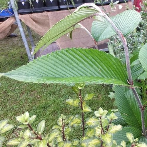 A recently discovered plant from the eastern Himalayas, Rubus calophyllus is a medium-sized, suckering, semi-evergreen shrub named for its beautiful leaves. These are ovate and pleated, up to a foot/30cm long, deep green above and silvery-white beneath, with serrated edges. The arching stems are whitish, with small, recurved, prickles. Deep wine-red flowers, ¾ “/1.5cm across, are borne in May and June, and are followed by red berries.