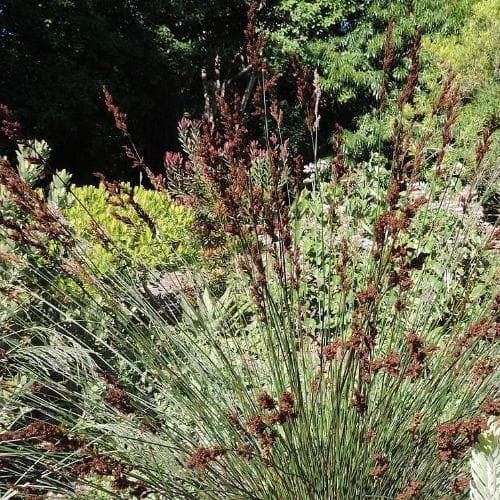 Used for thatching in its native Cape Province in South Africa, Thamnochortus insignis is a cool-season, evergreen, perennial restio with an upright, very arching, clump-forming habit. Not fully hardy, it’s for mild areas only, but is very good where an architectural specimen is needed. The leaves are very long, very narrow and variegated. From June to August, the plant bears very attractive, golden-brown flowers; these are grown at the tips of the culms (stems) and are followed by attractive seed-heads in mid-autumn. This plant can be grown in a large container, and brought inside for the winter in cooler areas. No need to prune, just remove any damaged or tatty foliage.